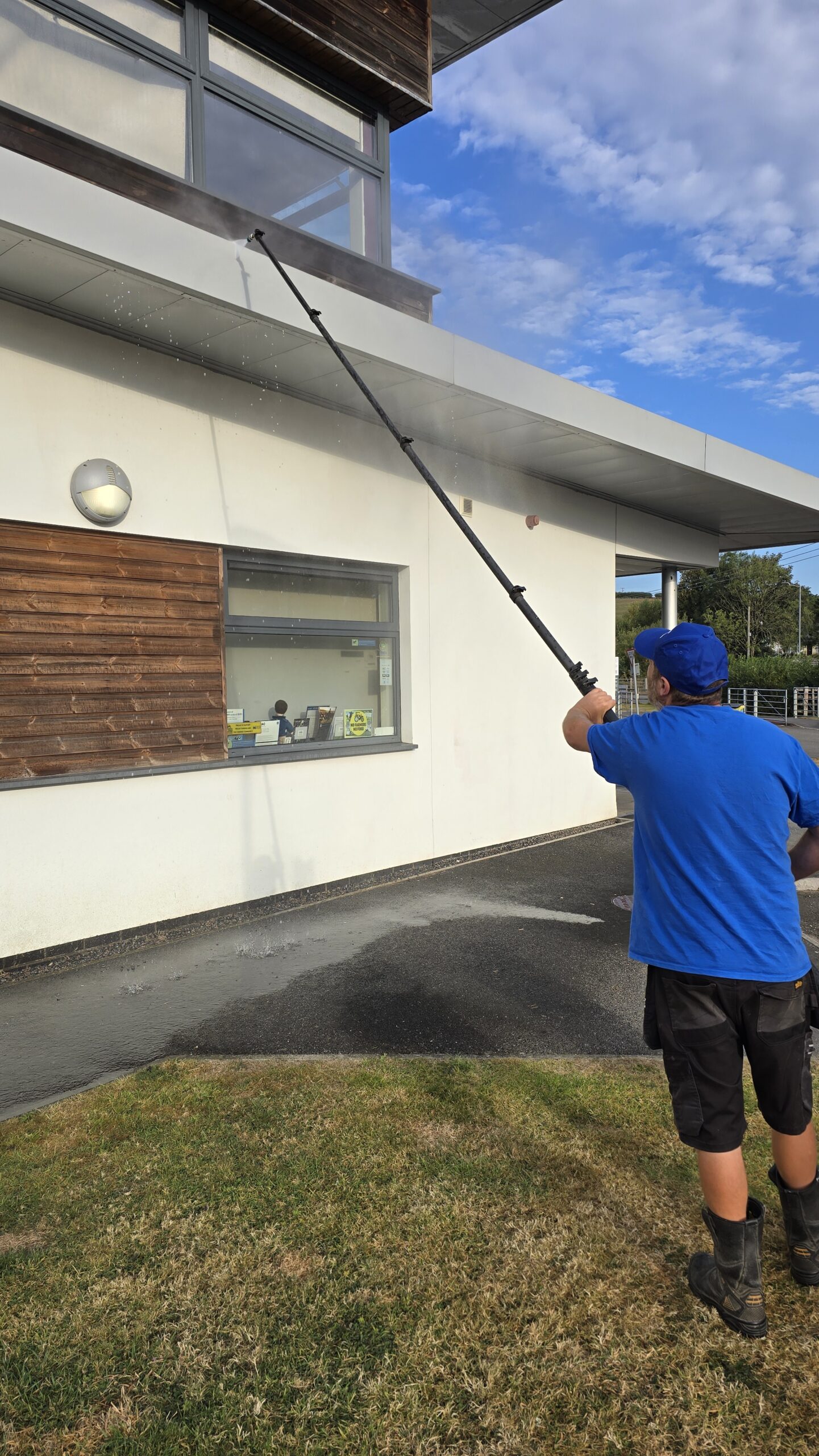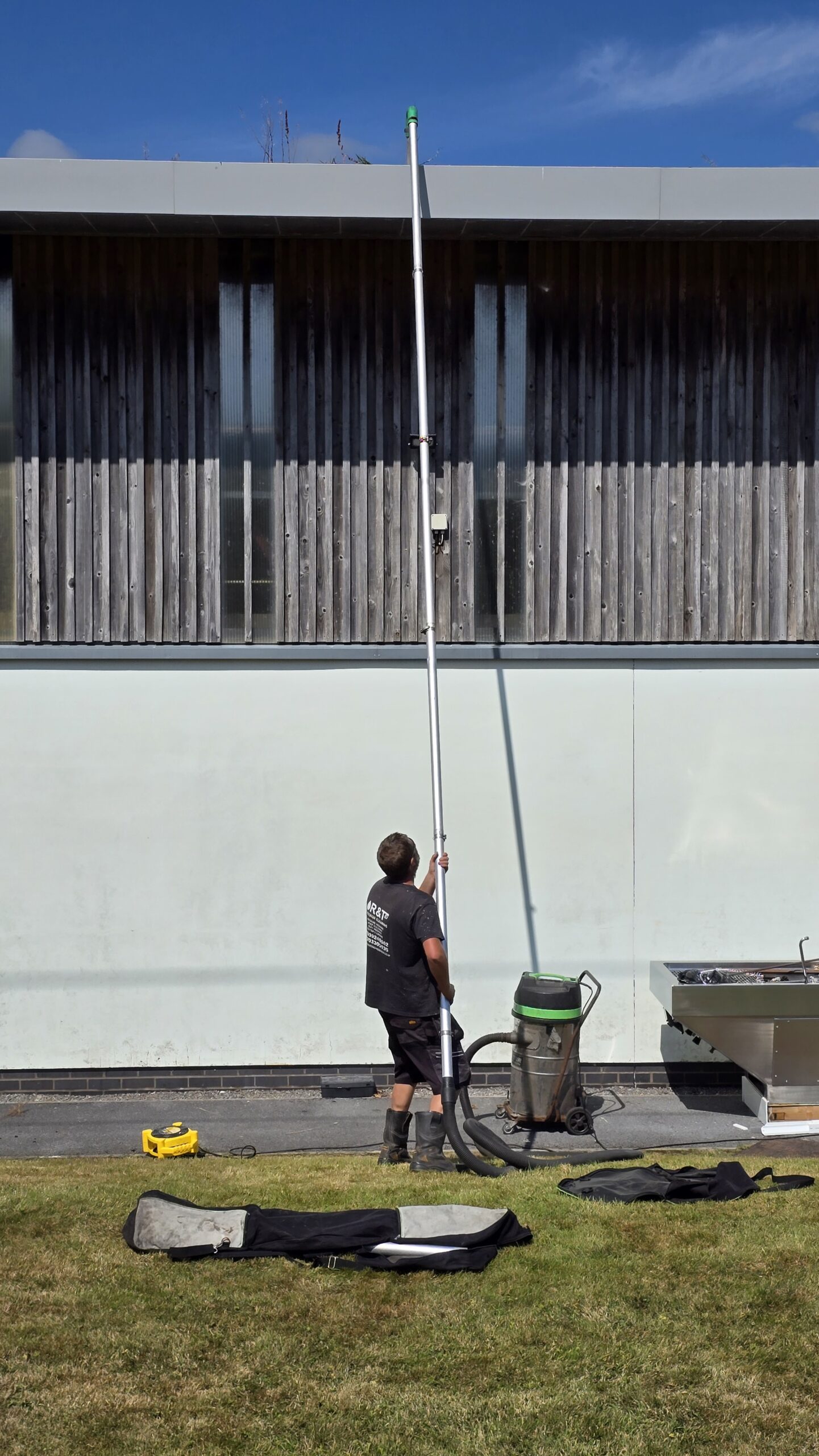We used a reach and wash system safely from the ground to clean the walls, windows and cladding and started early in the morning to avoid disruption of the practice which operates as both a vets and also equine and farm vets.